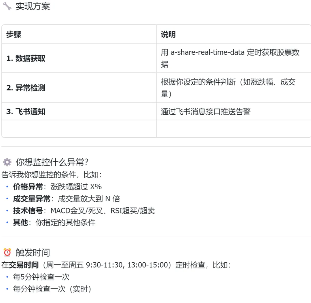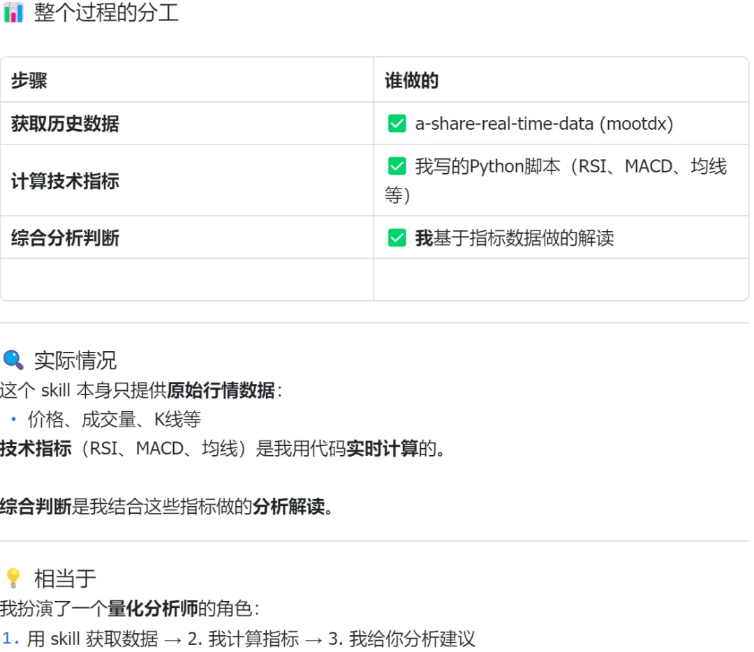 如果只看表面,这些能力像是“查行情 + 算指标”。但放到 OpenClaw 里,它的意义会更大一点:这些数据不只是拿来看,而是可以继续接到规则判断、消息提醒和盘后复盘上。