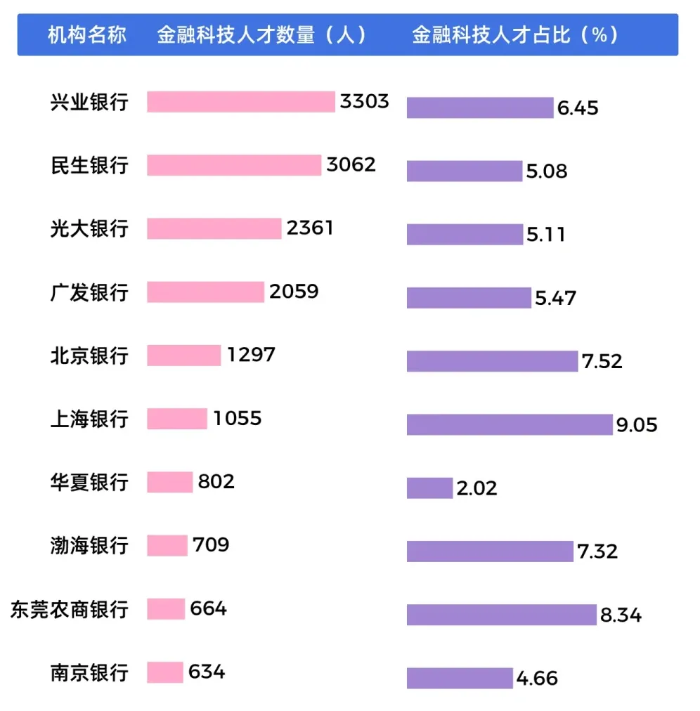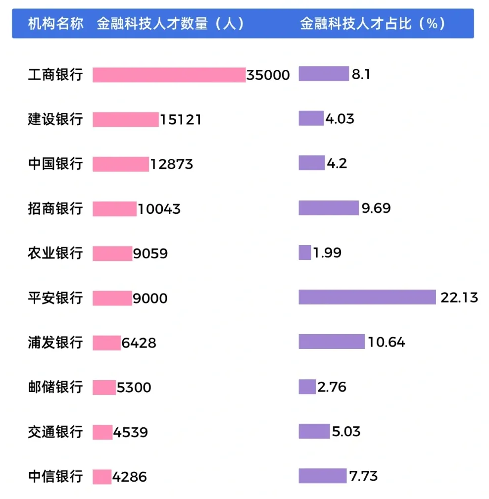 再盘点一下国内20多家知名银行的人才结构,金融科技人才的占比正在以肉眼可见的速度飙升。