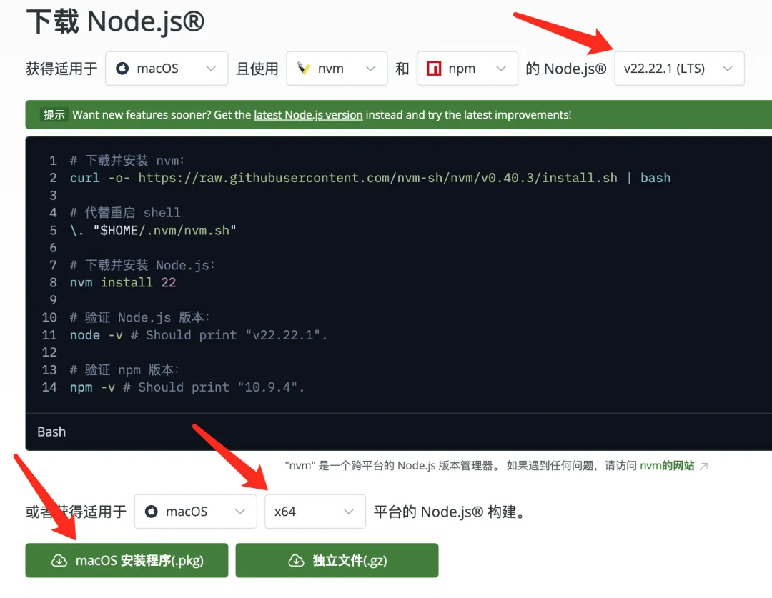 官方地址:https://nodejs.org/zh-cn/download,记得选一下版本和芯片: