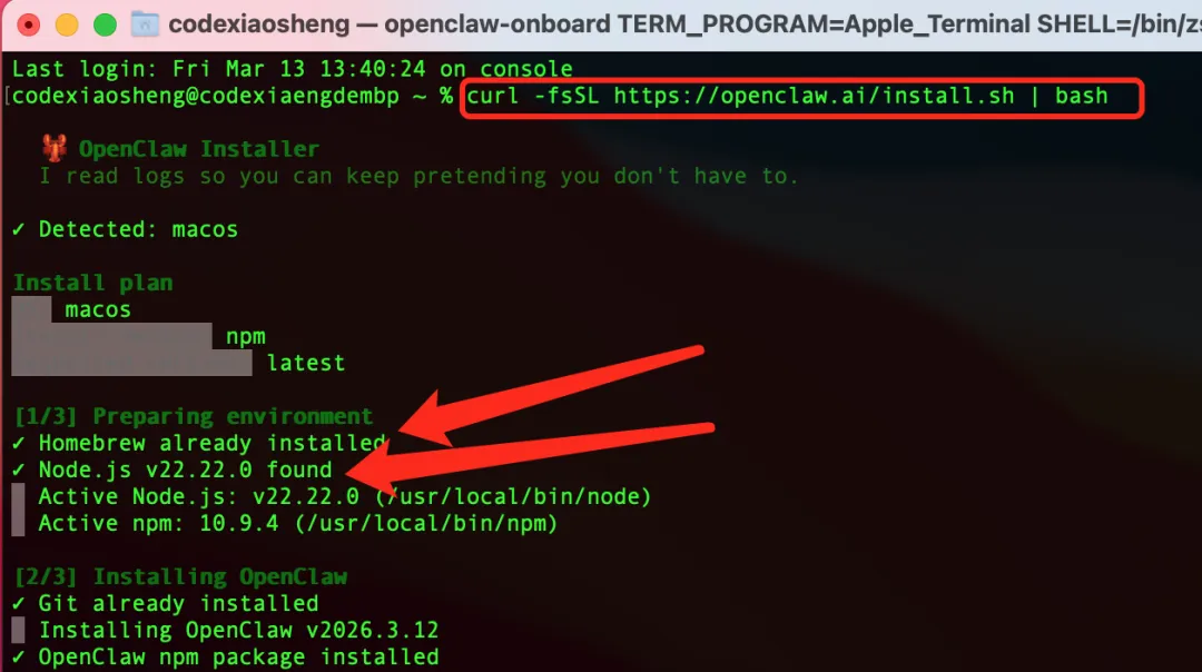 接着刚刚的终端窗口,输入本文刚开始从官网复制的一句话安装命令并回车