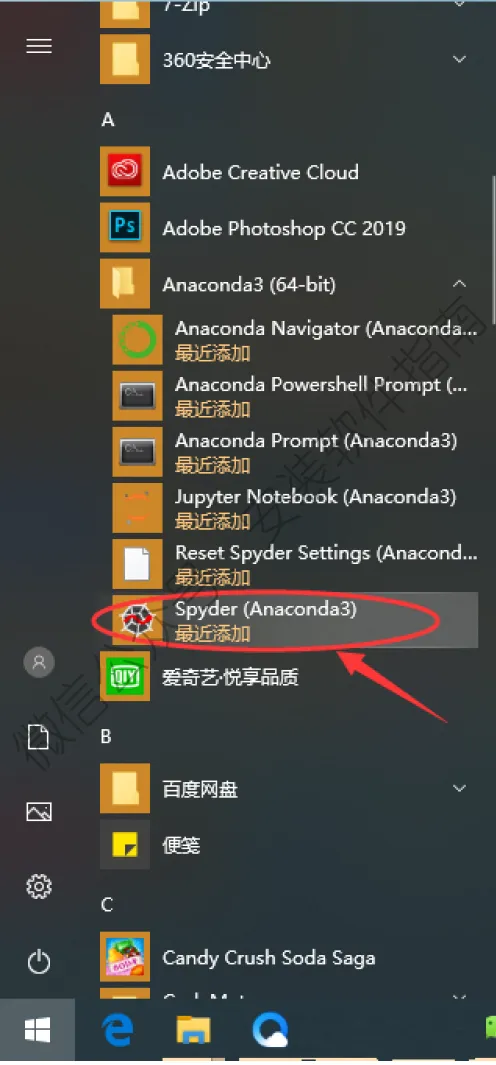 13、打开开始菜单,找到Spyder(Anaconda3),左键按住,拉到桌面。