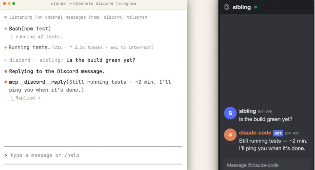 如果只看表面,你很容易觉得这件事没什么,无非就是把原来待在 terminal 里的 Claude Code 搬到了聊天软件里。终端能用,Telegram 也能用;本地能跑,Discord 也能跑。看起来只是界面换了,底层还是那个东西。