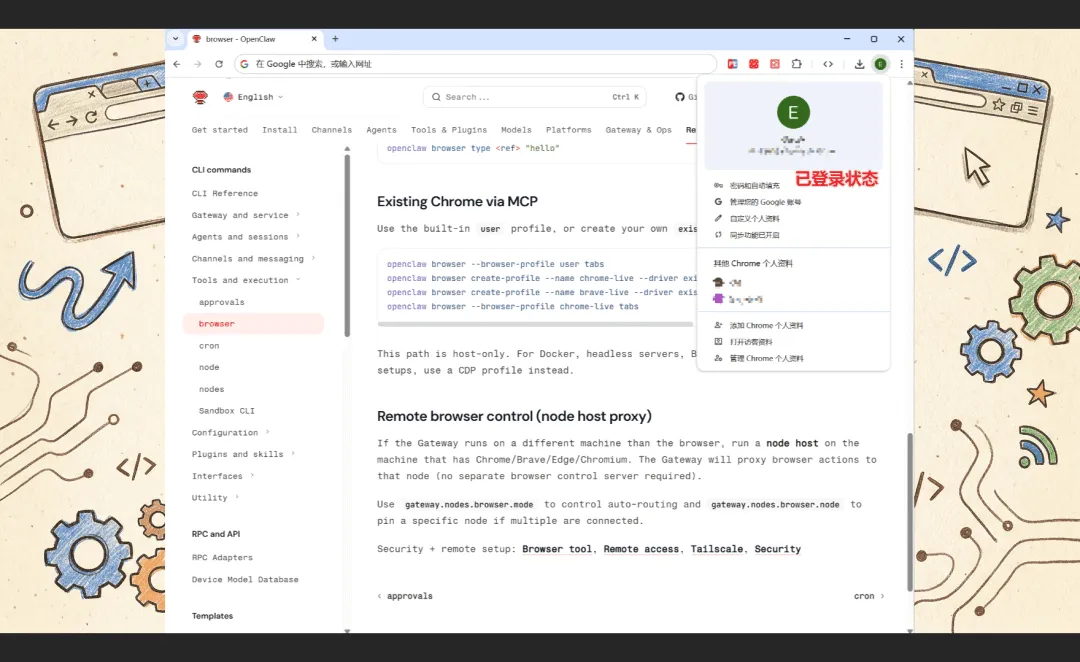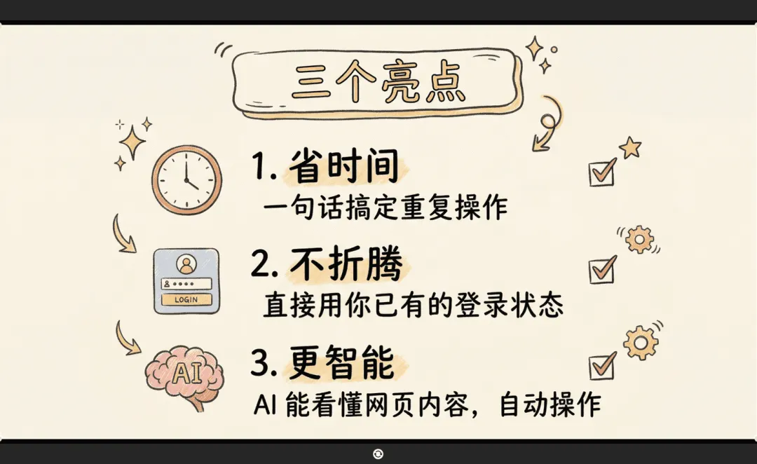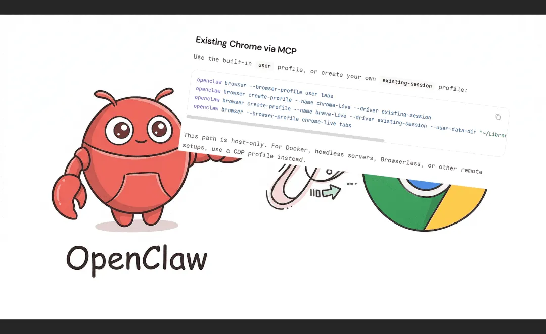 以前用 AI 操作浏览器,每次都要重新登录。现在不一样了——它用的是你已经在用的 Chrome 浏览器,官方文档把这个叫 user profile。