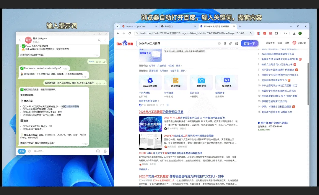 比如我想搜索"2026年AI工具推荐",以前需要:打开浏览器 → 打开搜索网站 → 输入关键词 → 点搜索。