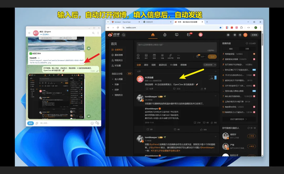 ounter(line打开微博,输入内容:测试微博:AI 自动发微博演示,OpenClaw 新功能真香!🚀