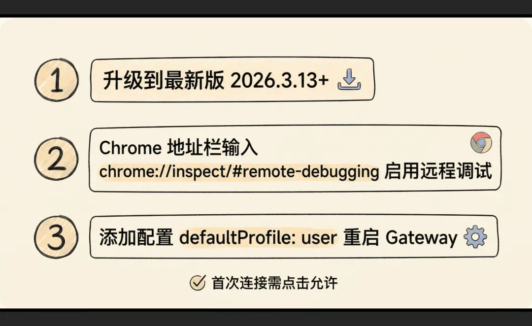 OpenClaw 3月13号发布的版本,新增了一个超实用的功能:让 AI 直接操作你已经在用的浏览器。