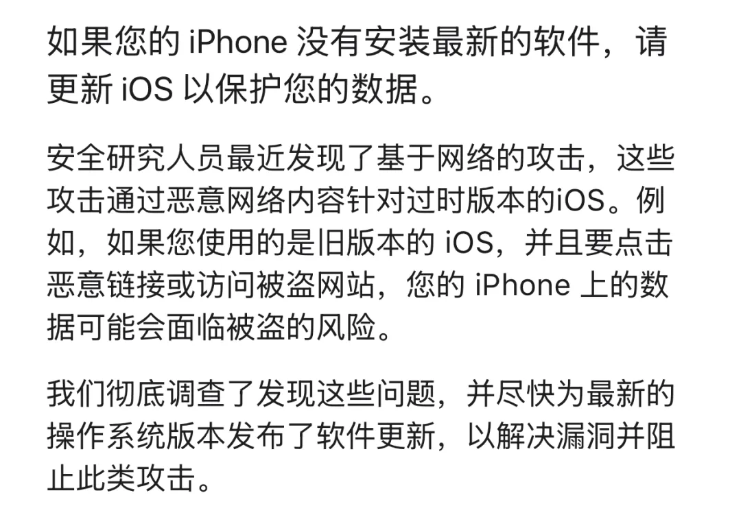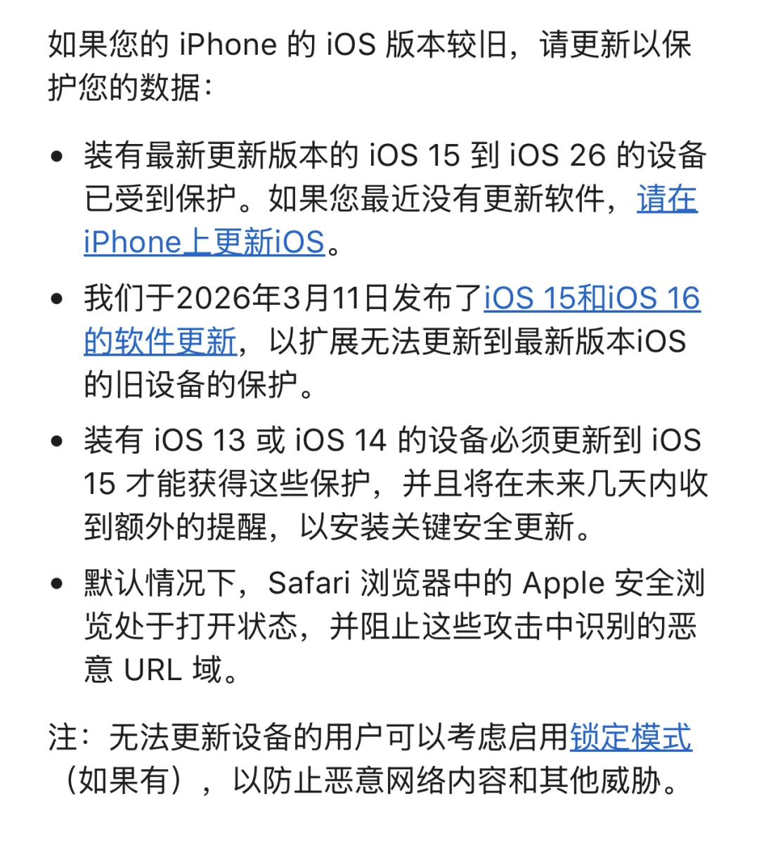 苹果紧急提醒,iOS 系统要升级!最近苹果在官网发布了一篇支持文档,文档主要目的就是提醒用户升级到新版本的系统,从而保护数据,防止设备被恶意攻击。苹果表示安全研究人员最近发现了一些针对过时版本 iOS 的基于网络的攻击,也就是说如果用户的设备运行的是旧版本 iOS,并且不小心点击了恶意链接或者访问了被盗网站,那么 iPhone 上的数据就可能存在被盗的风险。目前苹果已经发现了这些问题,并且发布了软件更新,解决漏洞阻止此类攻击。升级到最新版本的 iOS 15 - iOS 26 系统,设备将会受到保护。苹果还在前段时间发布了 iOS 15 和 iOS 16 的系统更新,用于给旧设备提供保护。还在运行 iOS 13 和 iOS 14 的设备必须要更新到 iOS 15 才能获得这些关键的安全性更新,防止设备被恶意攻击。