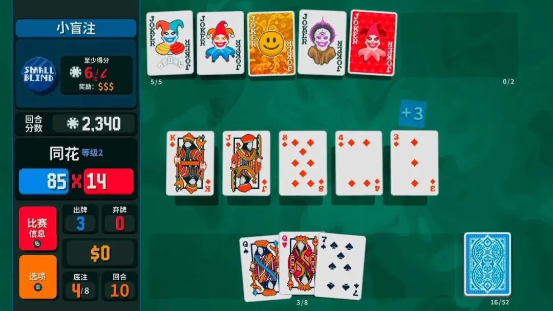 《小丑牌》是一款由单人开发者LocalThunk打造、在2024年横空出世并斩获TGA最佳独立游戏等三项大奖的现象级卡牌游戏,它以扑克为骨架、以肉鸽为灵魂,用看似简单易懂的规则撬动了近乎无限深的策略空间。游戏的目标并非传统扑克的比大小,而是在名为“底注”的八个递增难度关卡中,通过打出对子、顺子、同花等扑克牌型来累积筹码,击败小盲注、大盲注以及带有特殊限制的Boss盲注——从第一关仅需300分,到最后一关动辄数十万甚至上百万的分数要求,每一次出牌都是数字的爆炸式狂欢。
