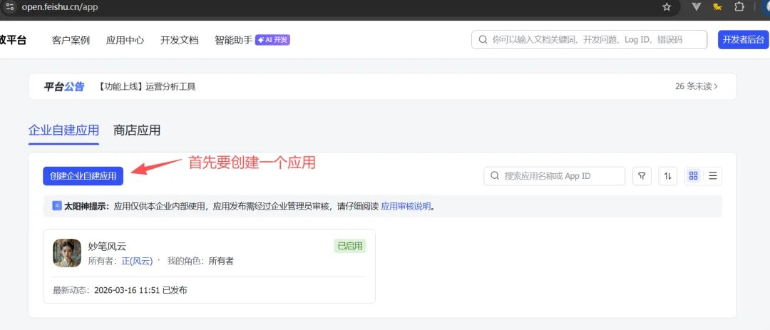 首先进入飞书管理后台https://open.feishu.cn/app?lang=zh-CN