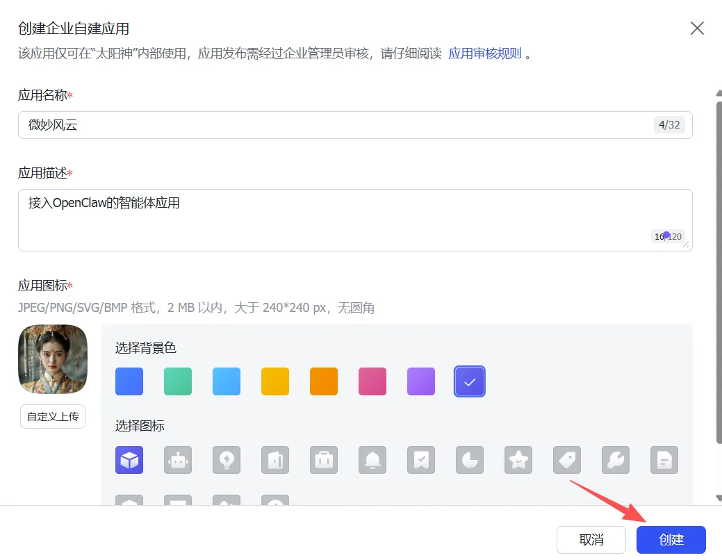 首先要创建一个应用,名称、描述、图标都可根据个人喜好自己定义