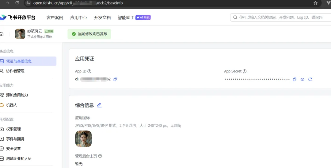 在飞书应用管理页,左侧导航栏找到 “凭据与基础信息” 栏目,找到 “App ID” 和 “App Secret” 两个参数,记下,等会在OpenClaw的配置中用到