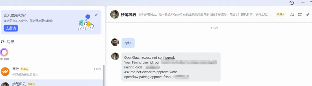 第一次给机器人发消息,会收到配对码(如Pairing code:XXXXX),在服务器终端执行配对命令。打开终端窗口,复制最后一行,即指令"openclaw pairing approve feishuXXXXX”,配置成功后,机器人即可正常接收和回复消息。