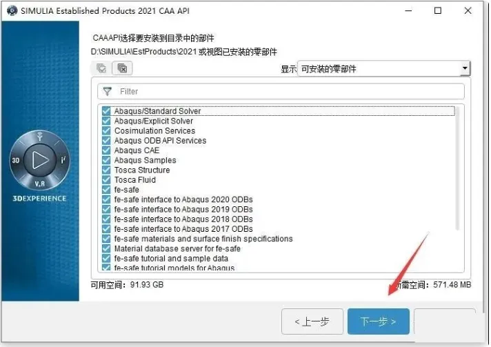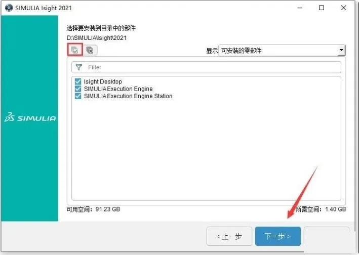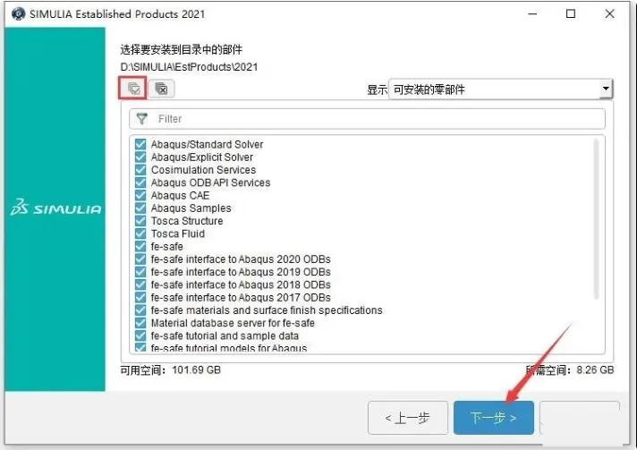 19. 在安装部件选择界面,点击【√】全选或者根据需要选择要安装的部件,然后点击“下一步”。