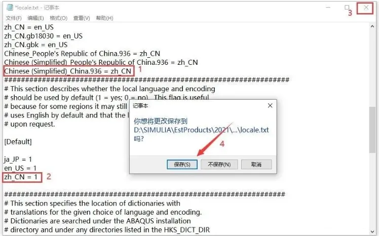 51. 在第二行"###"前添加【Chinese (Simplified)_China.936 = zh_CN】,并将第三行的【zh_CN = 0】修改为【zh_CN = 1】,然后点击右上角的【X】保存文件。