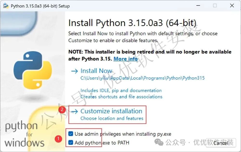 4、勾选【Add python…】,再点击【Customize installation】
