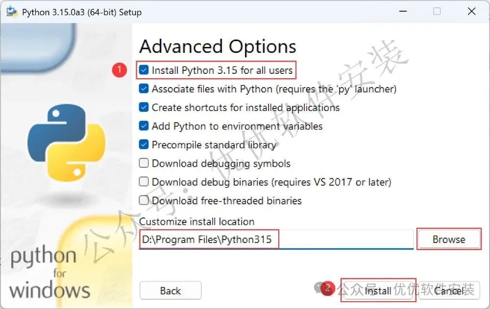 6、软件默认安装在C盘,可自定义更改软件安装位置,这里小编选择安装在D盘;勾选【Install Python 3.15…】,再点击【Install】