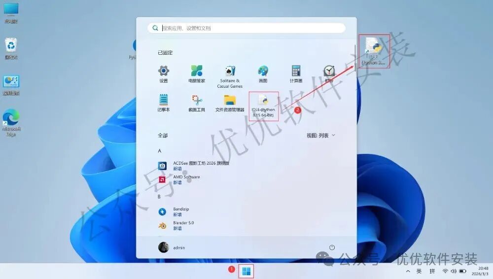 3、找到【python-3.15】应用程序,右键选择【以管理员身份运行】它