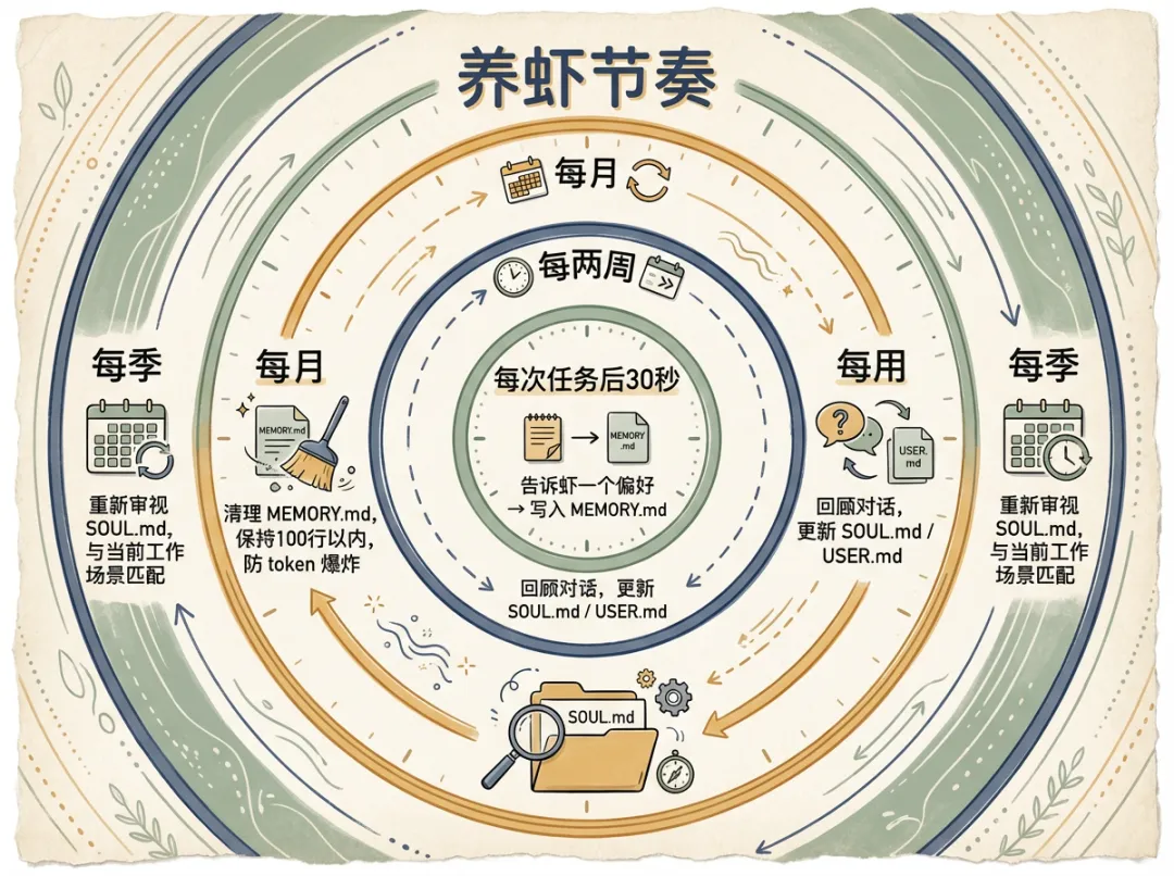 节奏上:MEMORY.md 随手驱动,有就记;USER.md 两周提炼一次;SOUL.md 一季度对齐一次。不需要每次任务后都做什么,摩擦越低,越能坚持。
