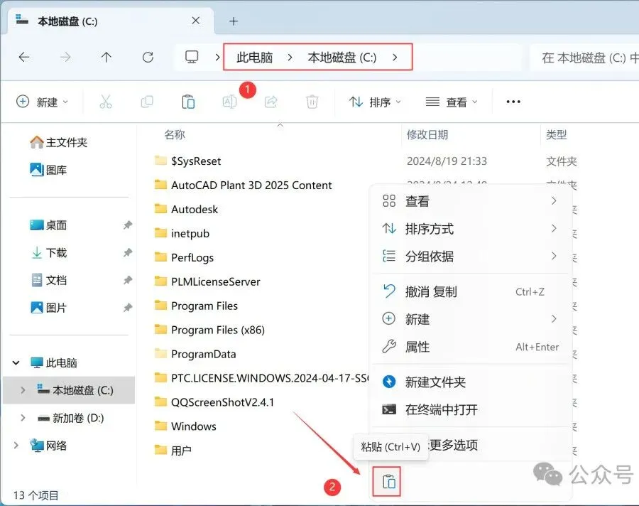 13、打开【本地磁盘C】,右键文件夹的空白处,点击【粘贴按钮】