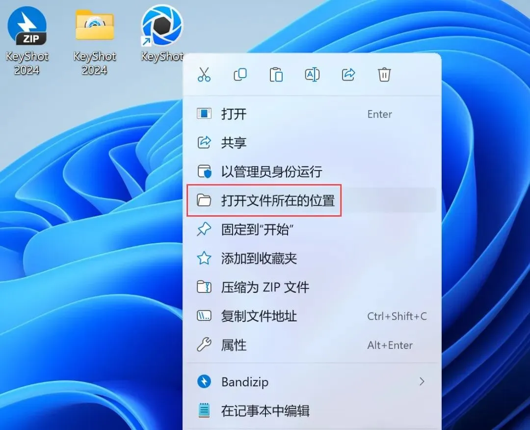 18、回到桌面,右键桌面上的【KeyShot 2024软件图标】,点击【打开文件所在的位置】