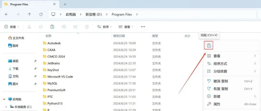 20、右键文件夹的空白处,点击【粘贴按钮】