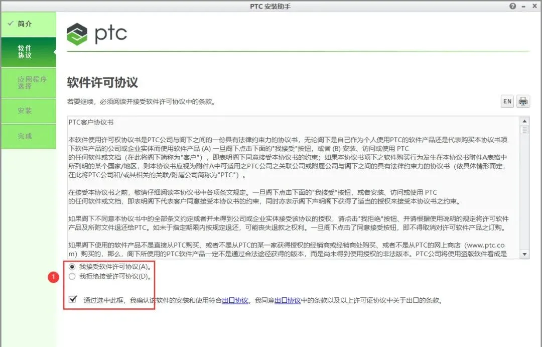 6、勾选【我接受】和【通过…】,再点击【下一步】