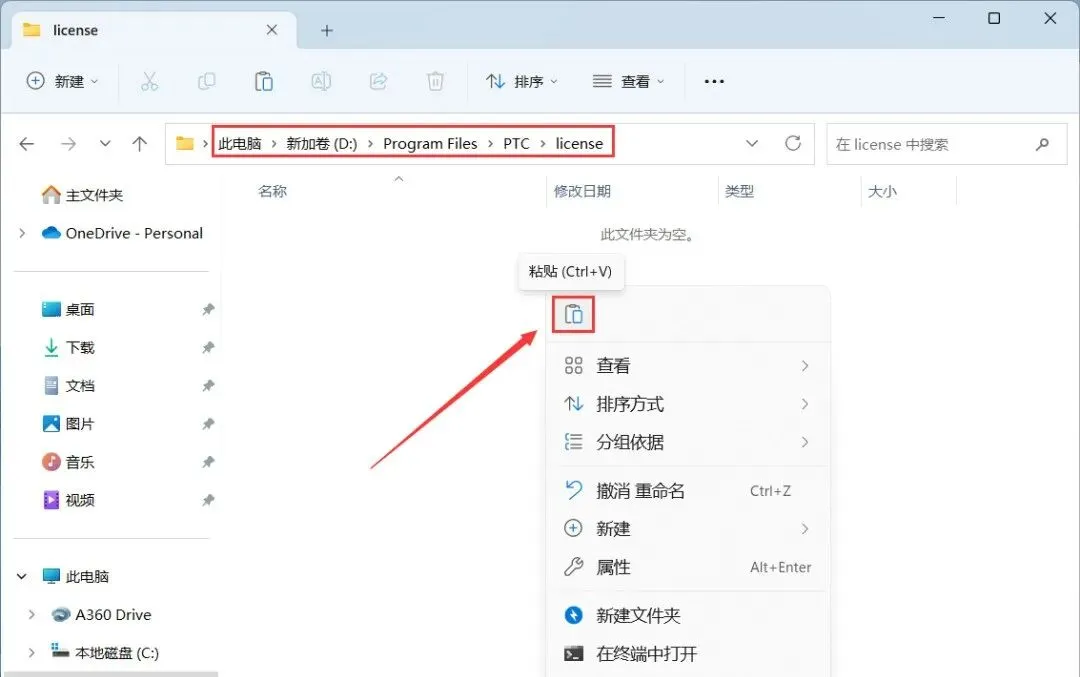 16、打开路径:D:\Program Files\PTC\ license,再右键文件夹的空白处,点击【粘贴按钮】