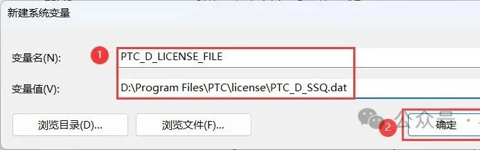 21、变量名输入:PTC_D_LICENSE_FILE;变量值输入:D:\Program Files\PTC\ license\ PTC_D_SSQ.dat,再点击【确定】