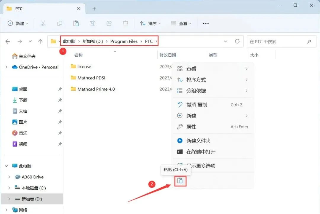 26、打开路径:D:\Program Files\PTC,再右键文件夹的空白处,点击【粘贴按钮】