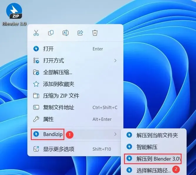 1、下载Blender 3.0软件安装包到电脑上,右键选择【解压到Blender 3.0\】
