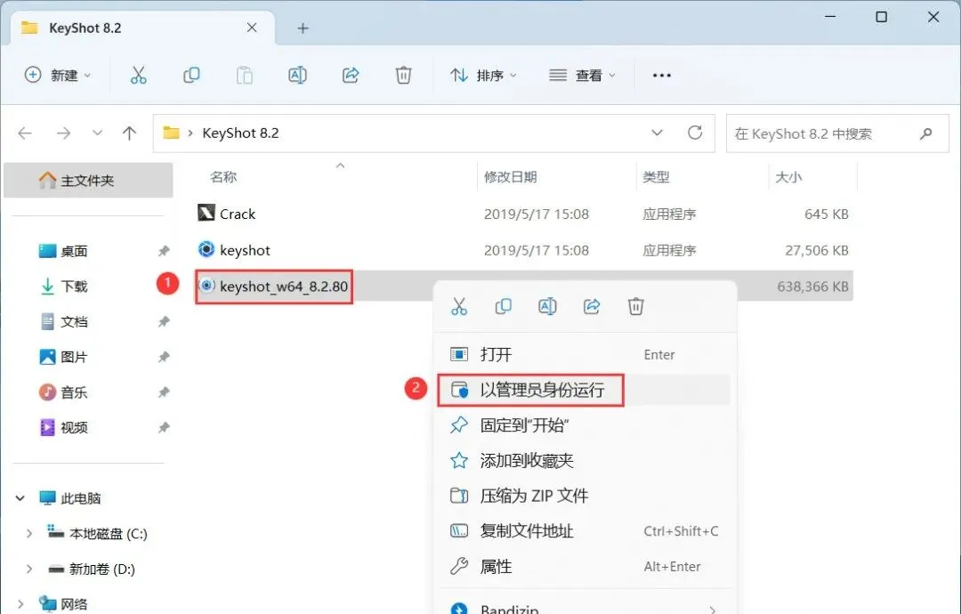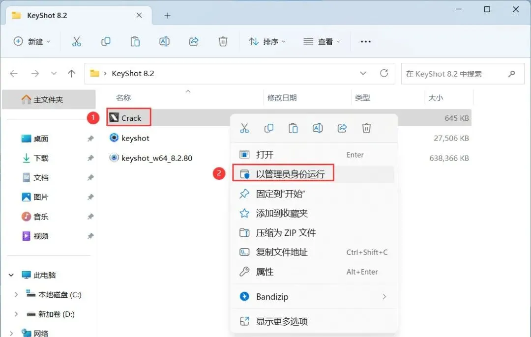15、回到KeyShot 8.2文件夹,找到【Crack】程序,右键选择【以管理员身份运行】它