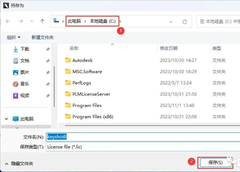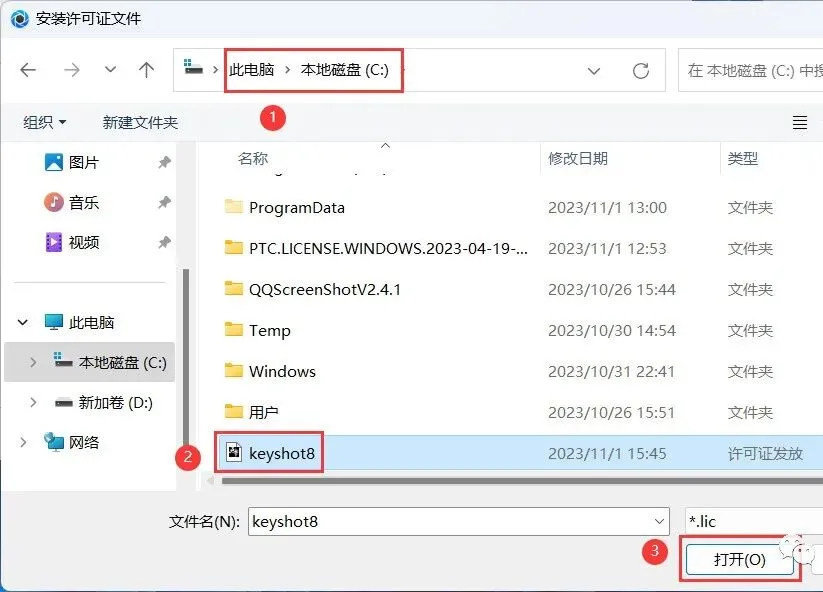 22、选择路径到C盘,找到并选中【Keyshot8】程序,再点击【打开】