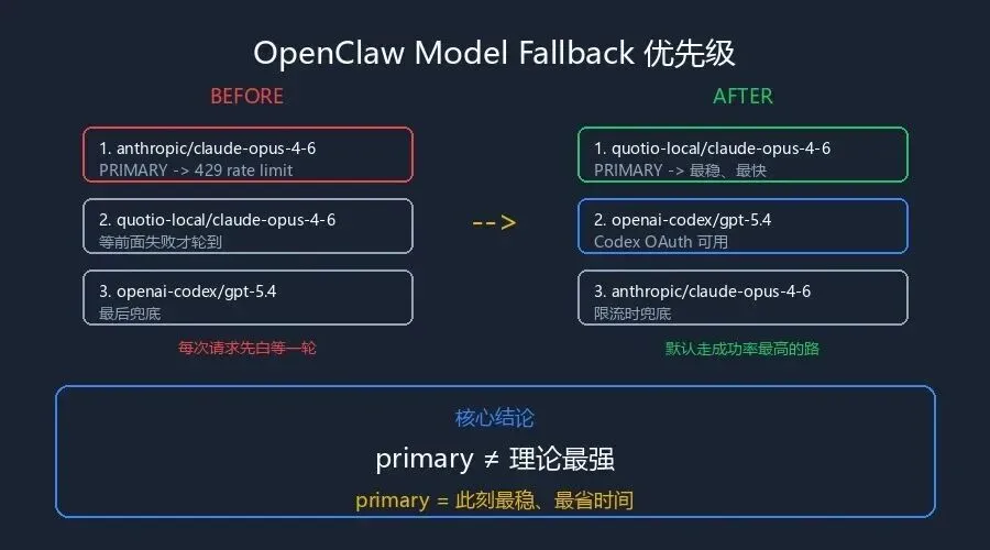 anthropic/claude-opus-4-6 -> rate_limit -> failover -> quotio-local/claude-opus-4-6 -> success也就是说,每次成功前,都可能先走一段明知大概率会失败的路。