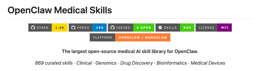 项目地址:https://github.com/FreedomIntelligence/OpenClaw-Medical-Skills/tree/main