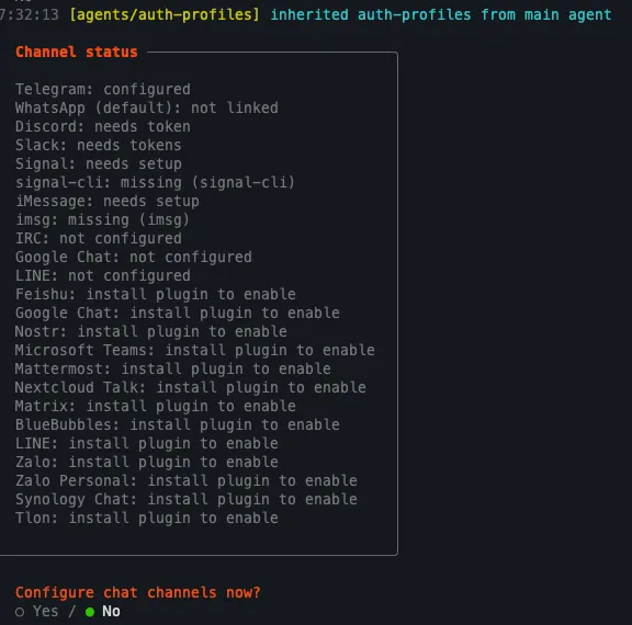 选择“是”(Yes):系统将引导您逐步添加并配置一个或多个聊天平台(频道)。完成后,您的代理就可以在该平台上运行和响应消息。