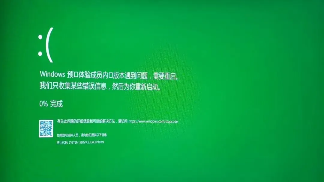 这是最常见的测试版系统绿屏。屏幕下方会有一行终止代码(如 SYSTEM_SERVICE_EXCEPTION、CRITICAL_PROCESS_DIED 等)。