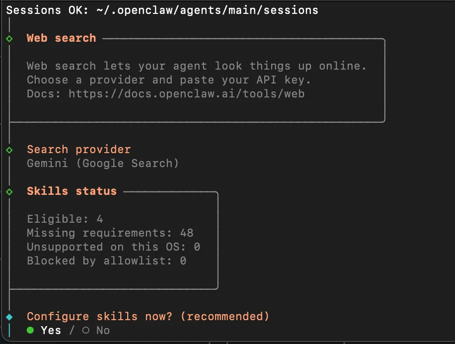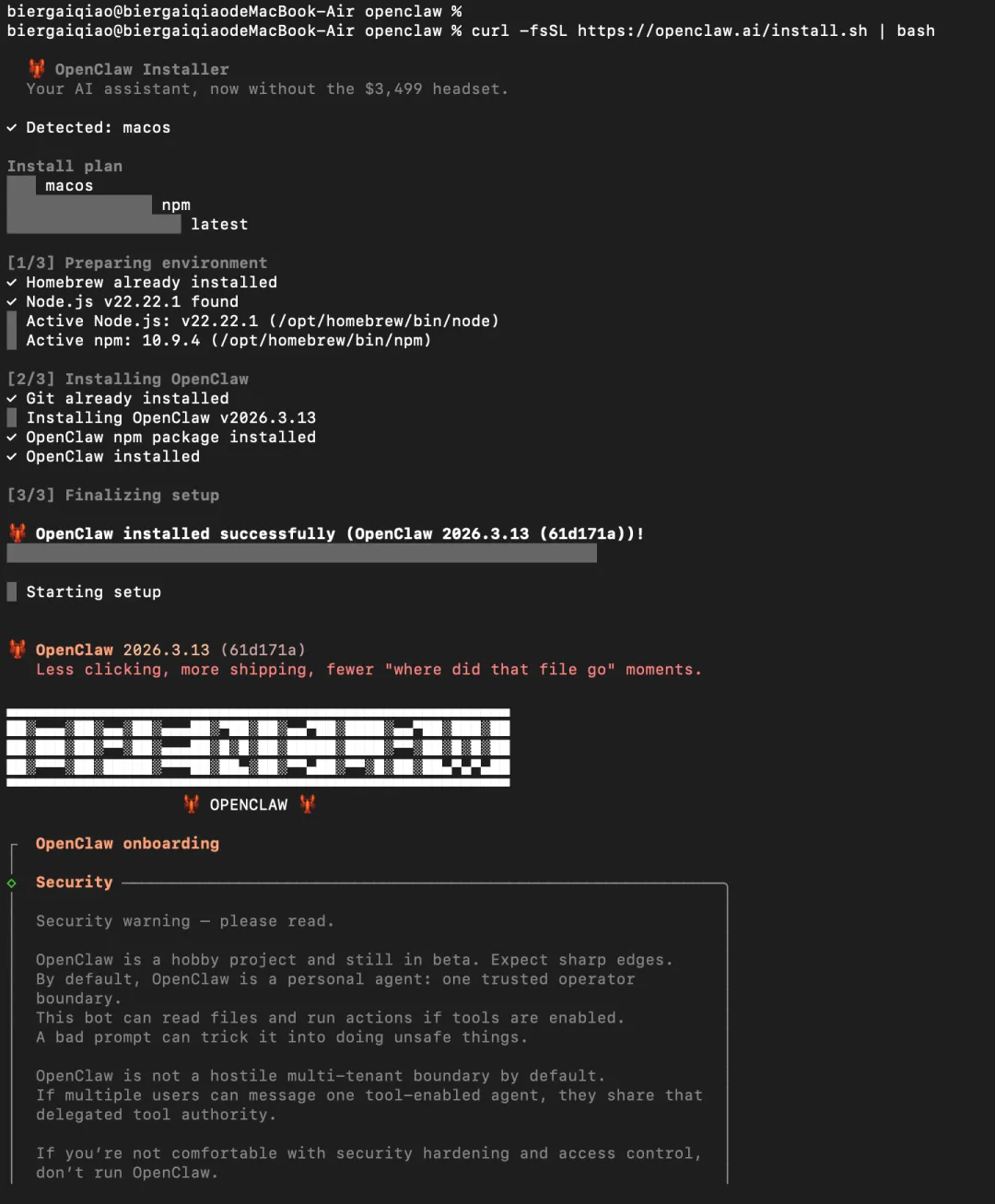 curl -fsSL https://openclaw.ai/install.sh | bash官方文档说明这是 macOS/Linux 的推荐安装方式;加 --no-onboard 可以先只安装,暂时不跑引导。