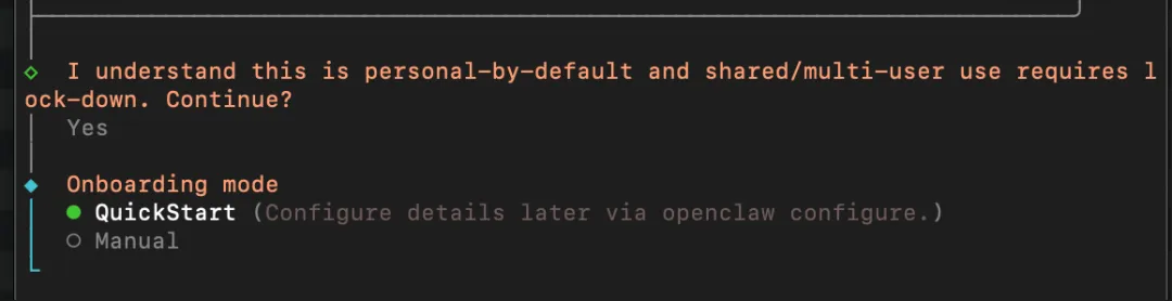 Security warning — please read. ││ ││ OpenClaw is a hobby project and still in beta. Expect sharp edges. ││ By default, OpenClaw is a personal agent: one trusted operator ││ boundary. ││ This bot can read files and run actions if tools are enabled. ││ A bad prompt can trick it into doing unsafe things. ││ ││ OpenClaw is not a hostile multi-tenant boundary by default. ││ If multiple users can message one tool-enabled agent, they share that ││ delegated tool authority. ││ ││ If you’re not comfortable with security hardening and access control, ││ don’t run OpenClaw. ││ Ask someone experienced to help before enabling tools or exposing it ││ to the internet. ││ ││ Recommended baseline: ││ - Pairing/allowlists + mention gating. ││ - Multi-user/shared inbox: split trust boundaries (separate ││ gateway/credentials, ideally separate OS users/hosts). ││ - Sandbox + least-privilege tools. ││ - Shared inboxes: isolate DM sessions (`session.dmScope: ││ per-channel-peer`) and keep tool access minimal. ││ - Keep secrets out of the agent’s reachable filesystem. ││ - Use the strongest available model for any bot with tools or ││ untrusted inboxes. ││ ││ Run regularly: ││ openclaw security audit --deep ││ openclaw security audit --fix ││ ││ Must read: https://docs.openclaw.ai/gateway/security 1.3 启动模式