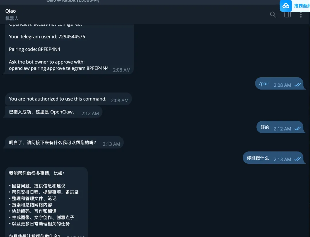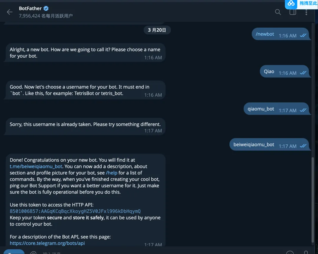 8501006857:AAGqKCqBqcXkoygHZ5V0JFxl996kDbHqymQDone! Congratulations on your new bot. You will find it at t.me/beiweiqiaomu_bot. You can now add a description, about section and profile picture for your bot, see /help for a list of commands. By the way, when you've finished creating your cool bot, ping our Bot Support if you want a better username for it. Just make sure the bot is fully operational before you do this.Use this token to access the HTTP API:8501006857:AAGqKCqBqcXkoygHZ5V0JFxl996kDbHqymQKeep your token secure and store it safely, it can be used by anyone to control your bot.For a description of the Bot API, see this page: https://core.telegram.org/bots/api第4步:配置skills
