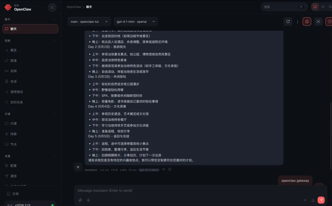 终端可以进行对话,如输入“给我一个五一计划”