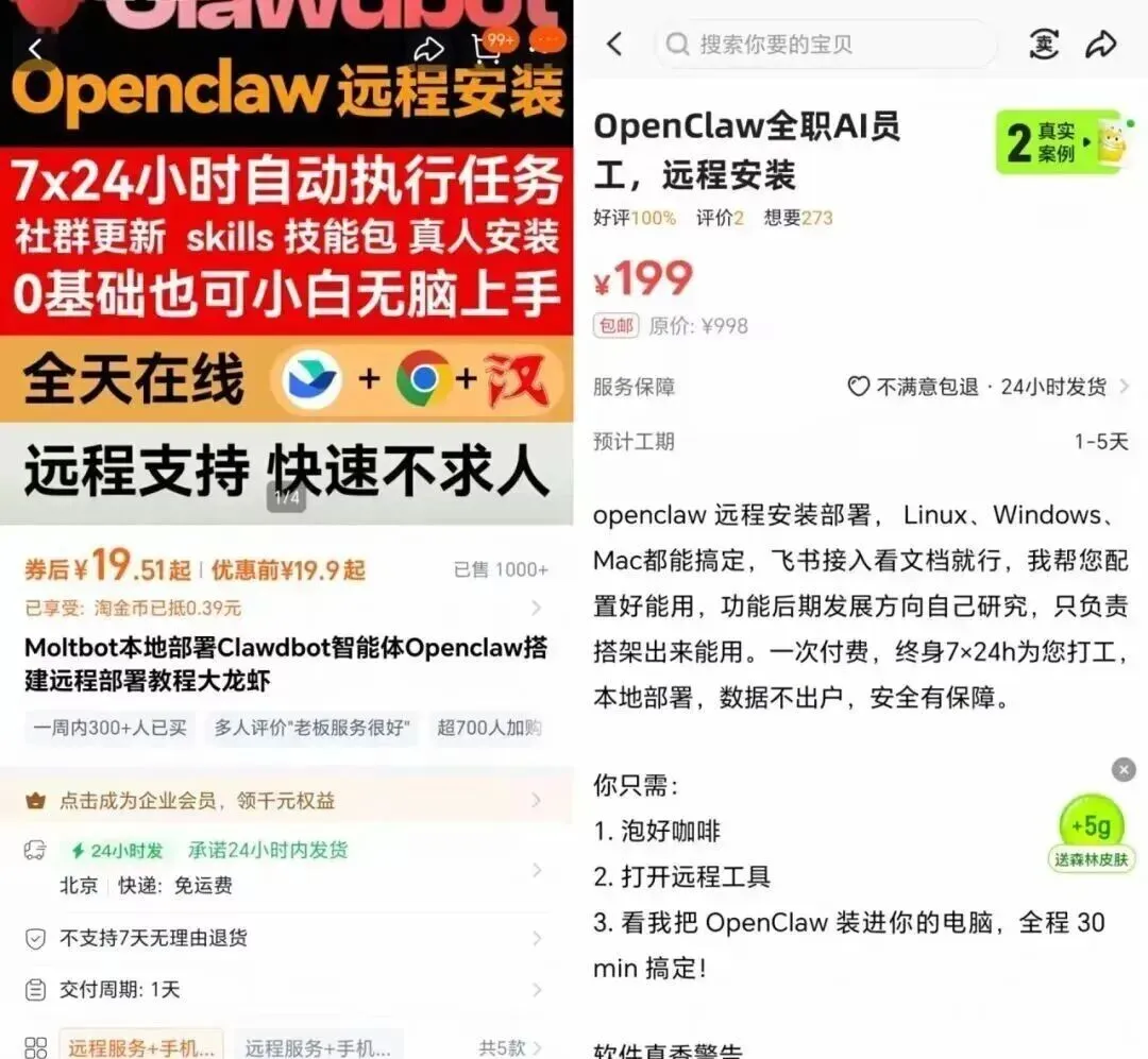 你看,市场上马上就有人开始提供“代部署”服务了,价格从几十块钱的远程帮你弄,到几百块钱的上门帮你配置好,啥价位都有。我上淘宝扫了一眼,有人卖OpenClaw的部署服务,单价几十到几百,月销量已经破千了。