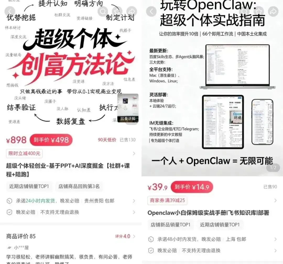 其实上面说的这几种,说白了就是虚拟电商最常见的几种变现形式。无非就是把“OpenClaw”这个热点,用教程、服务、社群这几种不同的产品形式,重新包装了一遍。