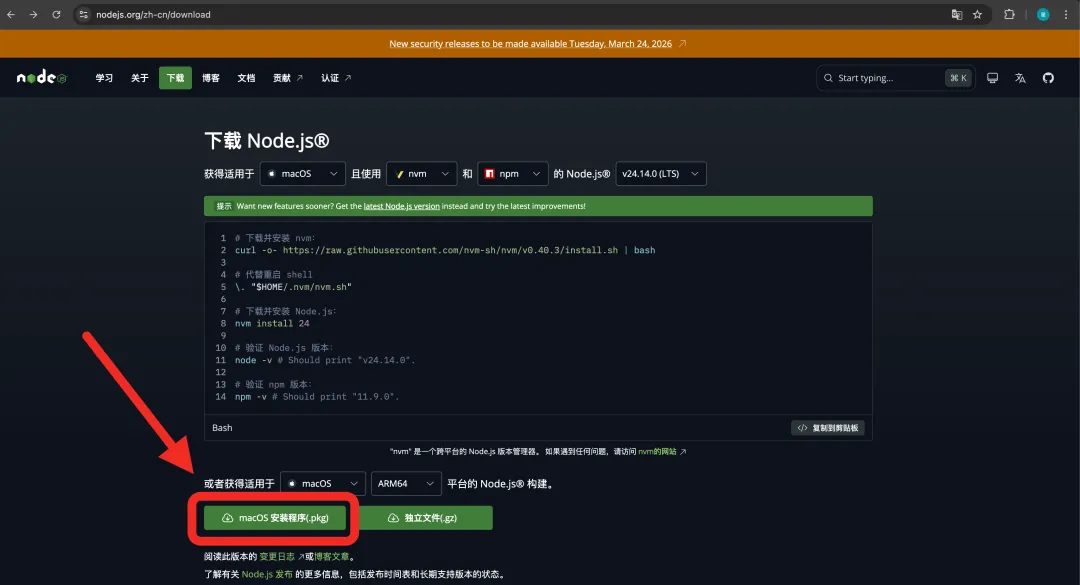 截至 2026 年 3 月 21 日,OpenClaw 官方文档要求 Node.js 22 或更高版本。对新手来说,最稳妥的做法,就是先安装 Node.js 官网提供的 LTS 长期支持版,然后再用 npm 安装 OpenClaw。