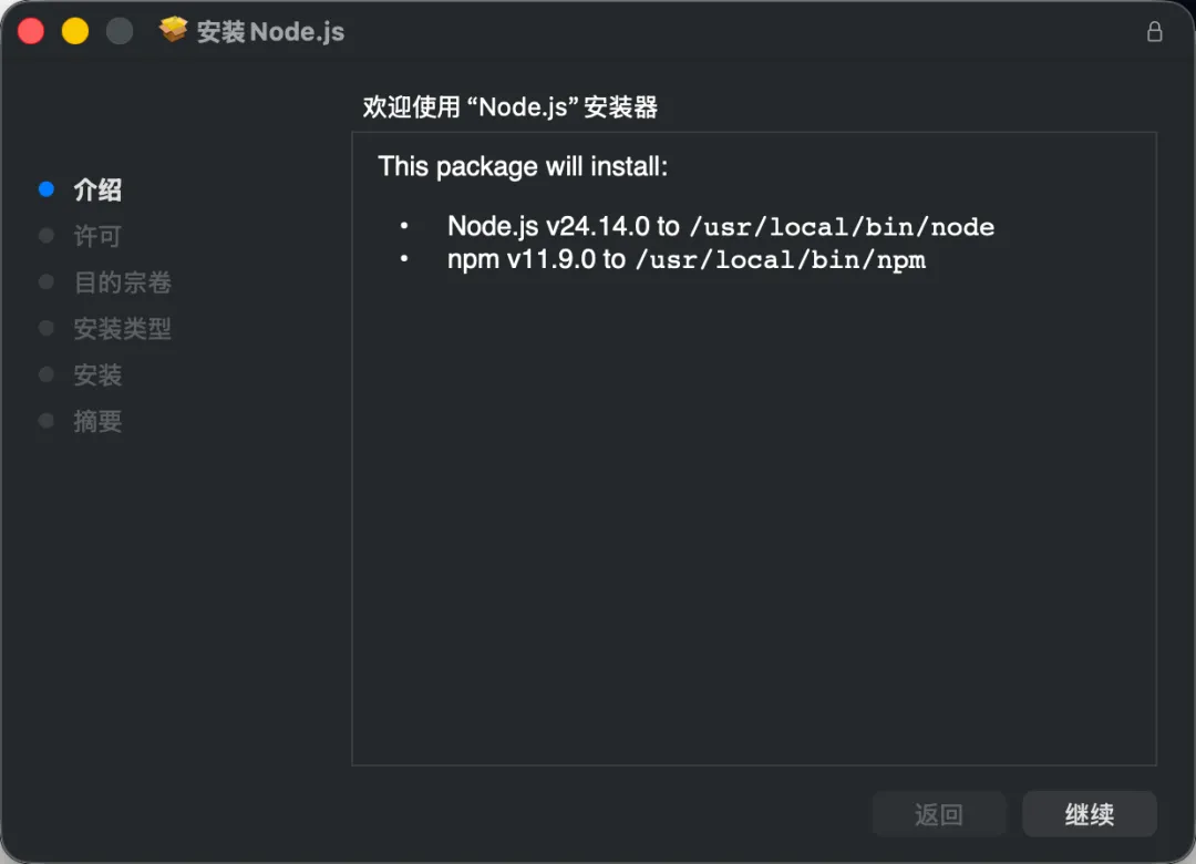 如果没有 Node.js,后面的安装命令就没法正常执行。
