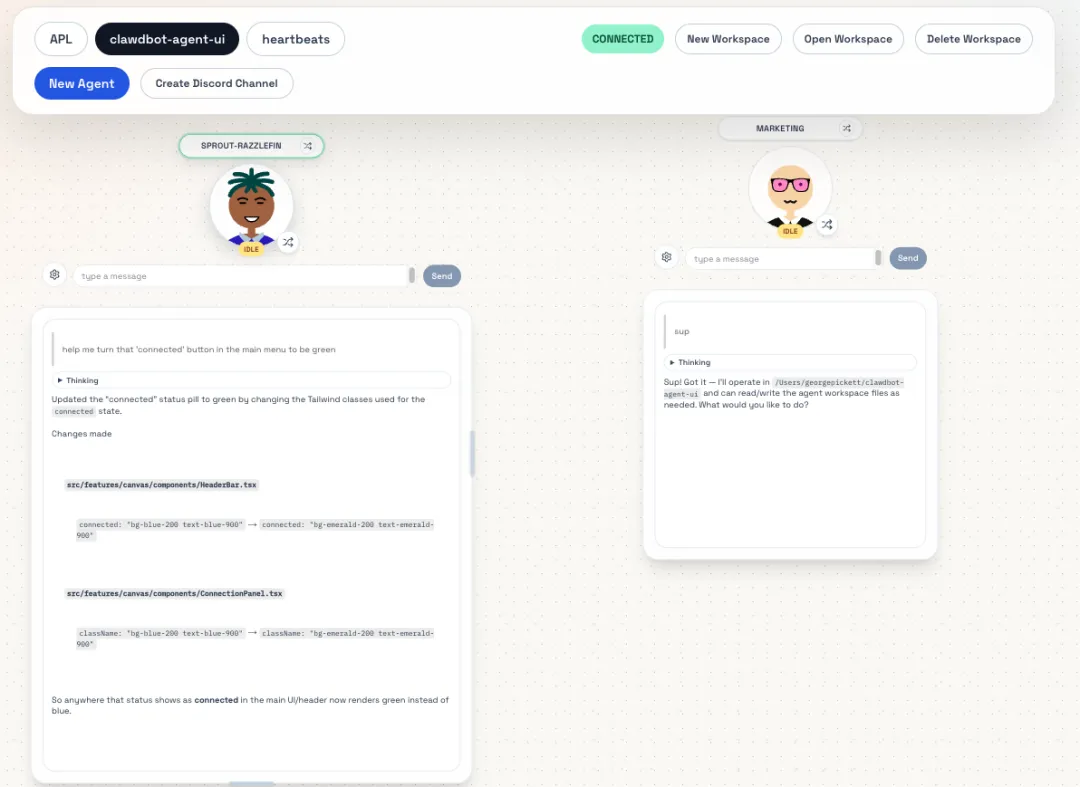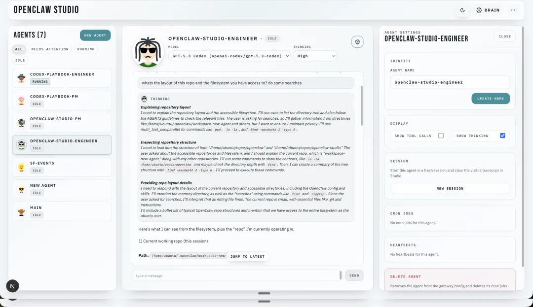 基础能力上,支持智能体舰队管理、实时聊天,网关运行时数据会实时同步,操作反馈及时; 3D 场景上,打造了细节丰富的复古 3D 办公室,有不同功能房间、可自由导航,AI 的工作行为还会触发动态视觉提示,氛围感十足; 技术设计上,搭建了专属的同域 WebSocket 代理,保证浏览器与 OpenClaw 网关的通信稳定,同时本地会持久化保存网关连接、智能体偏好等设置,无需重复配置; 操作空间上,实现了站会、代码审核、数据分析等场景的沉浸式操作,把传统的后台操作变成了可视化的空间交互。