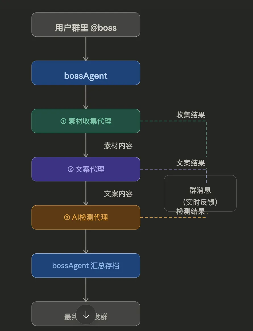 子Agent负责干活,并把任务传递给boss和群里。