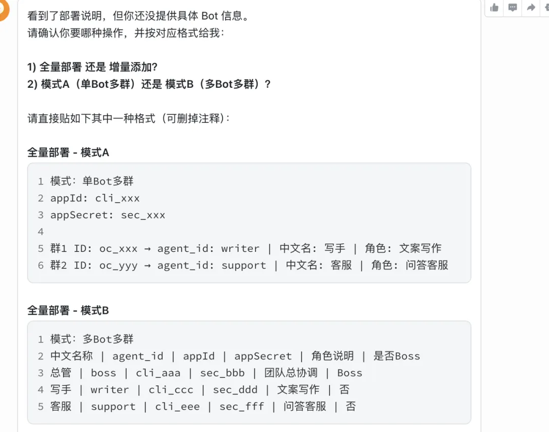 只需要告诉大模型你的飞书APPID、APPSecert、以及是否是boss节点就行。然后自动给你配置好。(提示词获取见尾部)