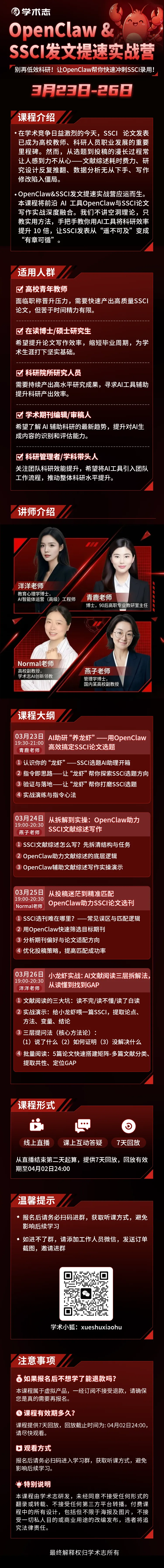 本课程将前沿 AI 工具 OpenClaw 与 SSCI 论文写作实战深度融合。我们不讲空洞理论,只教实用方法,手把手教你用 AI 工具将科研效率提升 10 倍,让 SSCI 发表从“遥不可及”变成“有章可循”。