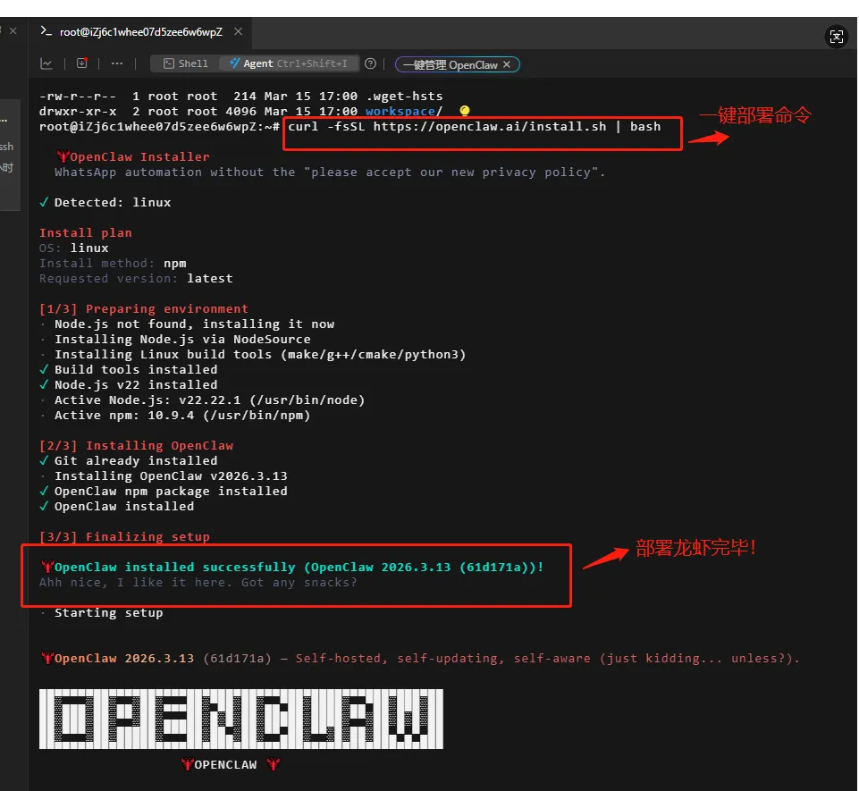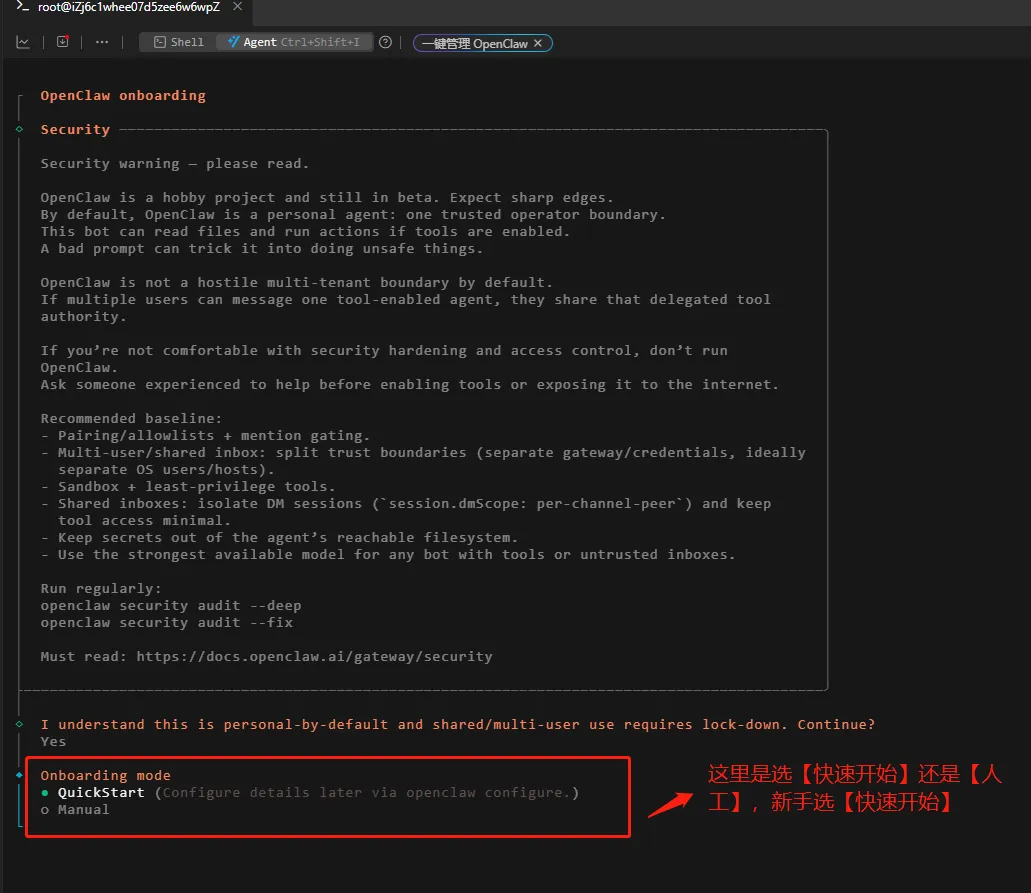 【技术】OpenClaw云服务器安装 近期OpenClaw的火热出圈让非技术向的普罗大众也开始能够参与到AI浪潮的大趋势之中,回归老本行,这篇文章主要解决以下几个问题: 1、不会编程技术的人需不需要去安装OpenClaw? 这里立即给出答案:如果安装OpenClaw都需要你在网上花几十块甚至上百块让人帮你安装,建议还是不要费钱去玩OpenClaw了。如果你对技术和AI有兴趣,也喜欢自己动手实践,那可以去玩玩试试,但基于目前token费用较高,如果不是要开公司做项目还是不要投入太多资金。 讲道理,真避免不了。OpenClaw的安全漏洞太多了,只要是稍微干过几年的骇客都能入侵小白的电脑,所以 我这次也是为了尽可能避免不影响自己本地电脑所以选择的云服务器安装,当然这对非技术人员会有点不友好,但其实打Linux命令并不难。 市面上云服务器厂商很多,但普通大众听得最多的其实就是阿里的阿里云和腾讯的腾讯云这两家。这两家对于新手都有免费的云服务器体验活动,大家可以去官网自行查看,我当时没有找到腾讯云的免费活动所以就选择的阿里云。 因为我用的阿里云免费体验版,所以提醒大家的是最好选择中国香港作为地域选择,中国内地只有20G的流量,中国香港有200G! (1)执行一键部署命令:curl -fsSL https://openclaw.ai/install.sh | bash 我拉取千问时,它一直在请求千问网址但就是没有响应,我就打算晚点再试试,先去看哪家的大模型便宜点。 本来千问是有免费的Token可以使用的,但需要每天抢名额,抢不到我就打算买最低额度,但大厂的规则太复杂了,担心用完额度后自动续费。 选来选去还是Deepseek最直接,起充10块,调试OpenClaw完全够用了,界面也超简单,对新手友好,且有余额警戒线,不会让AI疯狂消耗我的Token。 选好大模型后,大家可以继续配置,我是用的Deepseek+飞书的模式去命令的OpenClaw,推荐大家看这个博文去配置: https://blog.csdn.net/weixin_37540091/article/details/158571773