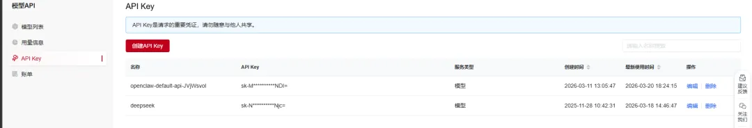 领取额度后,必须创建 API Key 才能对接 OpenClaw: